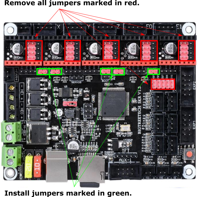 - Place stepper drivers for X, Y, Z, Z1, and E in positions X, Y, Z, E0, and E1
