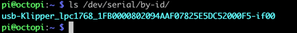 - Copy the device ID (e.g. usb-Klipper_lpc1768_1FB0000802094AAF07825E5DC52000F5-if00) from the terminal window and paste into a temporary text file.