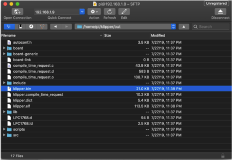 The make command, when completed, creates a firmware file klipper.bin that is store in the folder /home/pi/klipper/out. This file need to be copied to the FLY board. The easiest way to do this is to use a GUI like WinSCP on Windows or either Cyberduck or scp (from terminal) on Mac to copy the file to your computer.