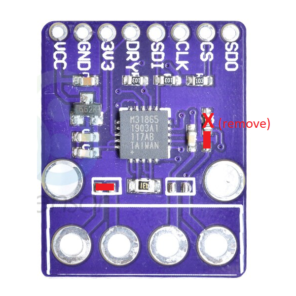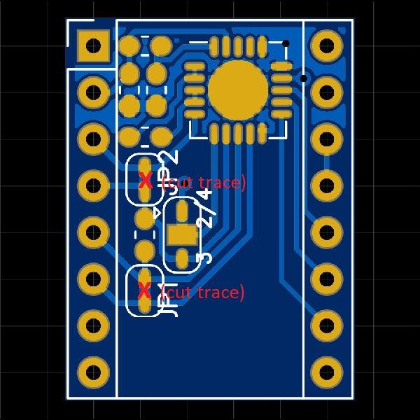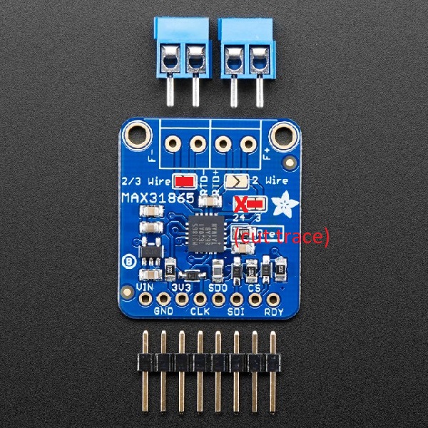 This step requires soldering. You need to bridge some pads to configure your MAX31865 board to work with your PT100 sensor. The pads to jump are marked with red rectangles and traces to cut are marked with a red “x”.