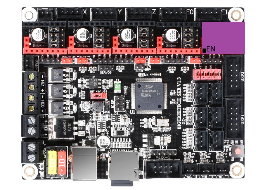 Insert your PT100 stick to the E1 stepper driver slot. Pay attention to the orientation. The “EN” pin is marked on the PT100 stick, and it should match the “EN” pin on your board.