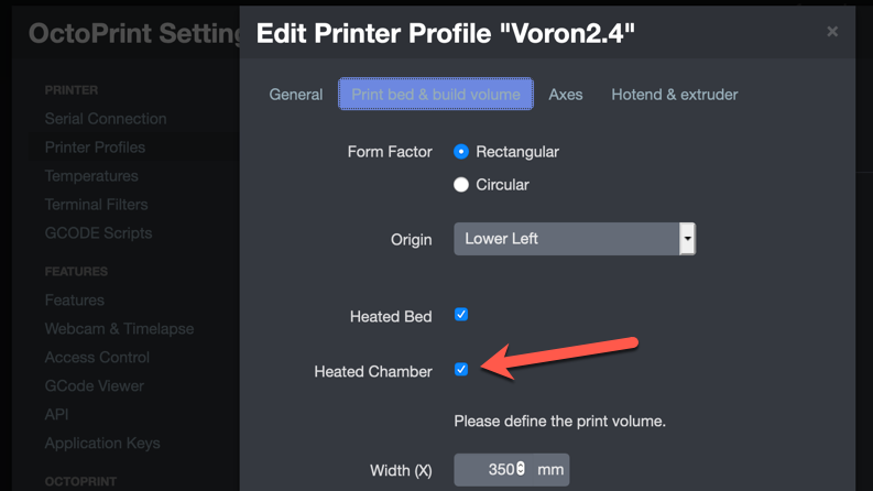 In Octoprint, enable the chamber temperature sensor by going into Settings -> Printer Profiles -> Printer. Edit the profile and go under “Print bed and Build volume”. Locate the checkbox for “Heated Chamber” and enable it.